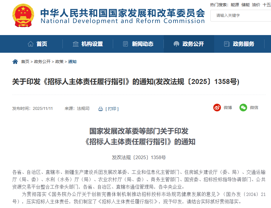 國家發(fā)展改革委等部門印發(fā)《招標人主體責任履行指引》(發(fā)改法規(guī)〔2025〕1358號)