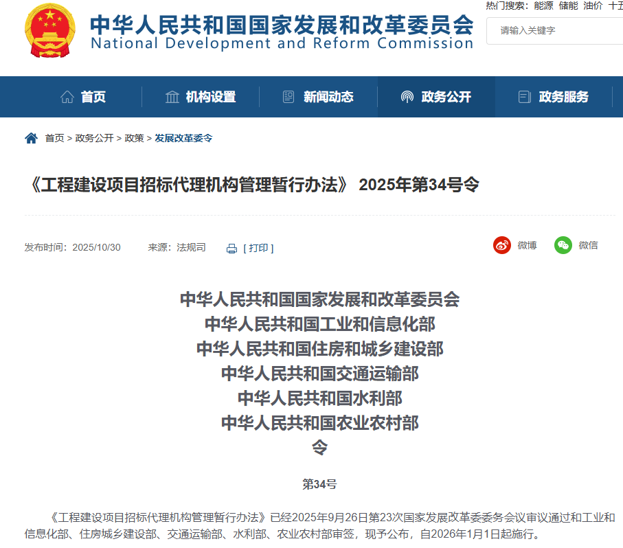 《工程建設項目招標代理機構管理暫行辦法》已經2025年9月26日第23次國家發(fā)展改革委委務會議審議通過和工業(yè)和信息化部、住房城鄉(xiāng)建設部、交通運輸部、水利部、農業(yè)農村部審簽,現(xiàn)予公布,自2026年1月1日起施行。